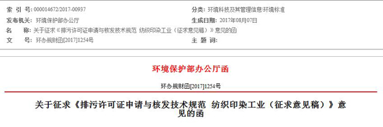 關于征求《排污許可證申請與核發技術規范紡織印染工業(征求意見稿)》意見的函