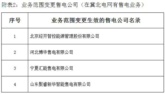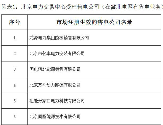 冀北電力交易中心有限公司于2017年10月19日至2017年11月19日共對13家售電公司進行了公示,具體為:北京電力交易中心受理并在冀北電網有售電業務的龍源電力集團能源銷售有限公司等9家售電公司;北京電力交易中心推送業務范圍變更至冀北的北京經開智控能源管理股份有限公司等4家售電公司。