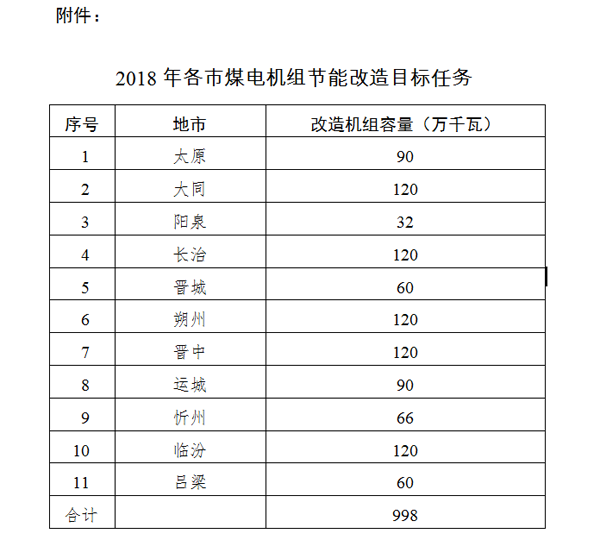 近日,山西省印發(fā)了《2018年各市燃煤機組節(jié)能改造目標任務》。具體任務如下: