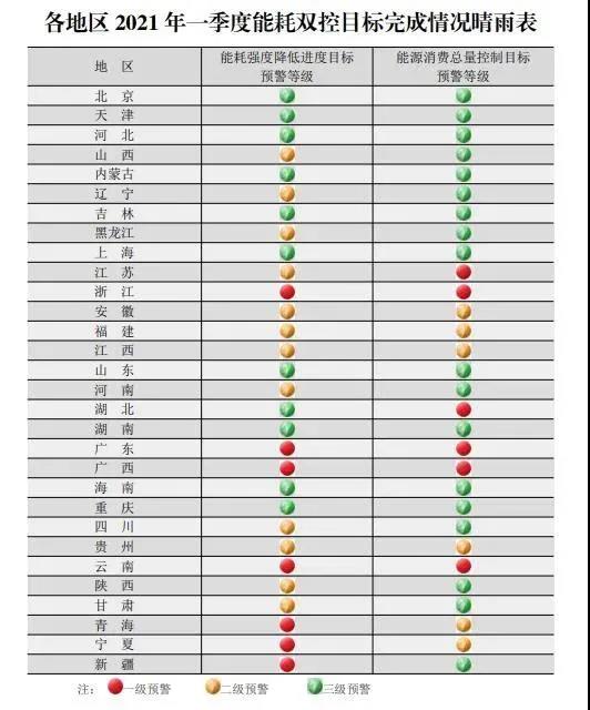 為貫徹落實黨中央、國務院關于強化能源消費總量和強度雙控的決策部署,加強能耗雙控形勢分析預警,國家發(fā)展改革研究提出了《各地區(qū)2021年一季度能耗雙控目標完成情況晴雨表》。